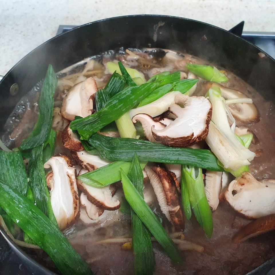 끓기 시작하면 집간장으로 간을 해주고, 준비한 표고버섯과 대파를 넣어 다시금 끓여줍니다.