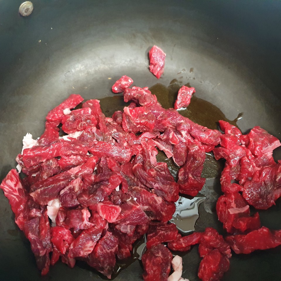 냄비에 참기름 두숟갈 정도를 넣고 양지머리를 달달 볶아줍니다.
