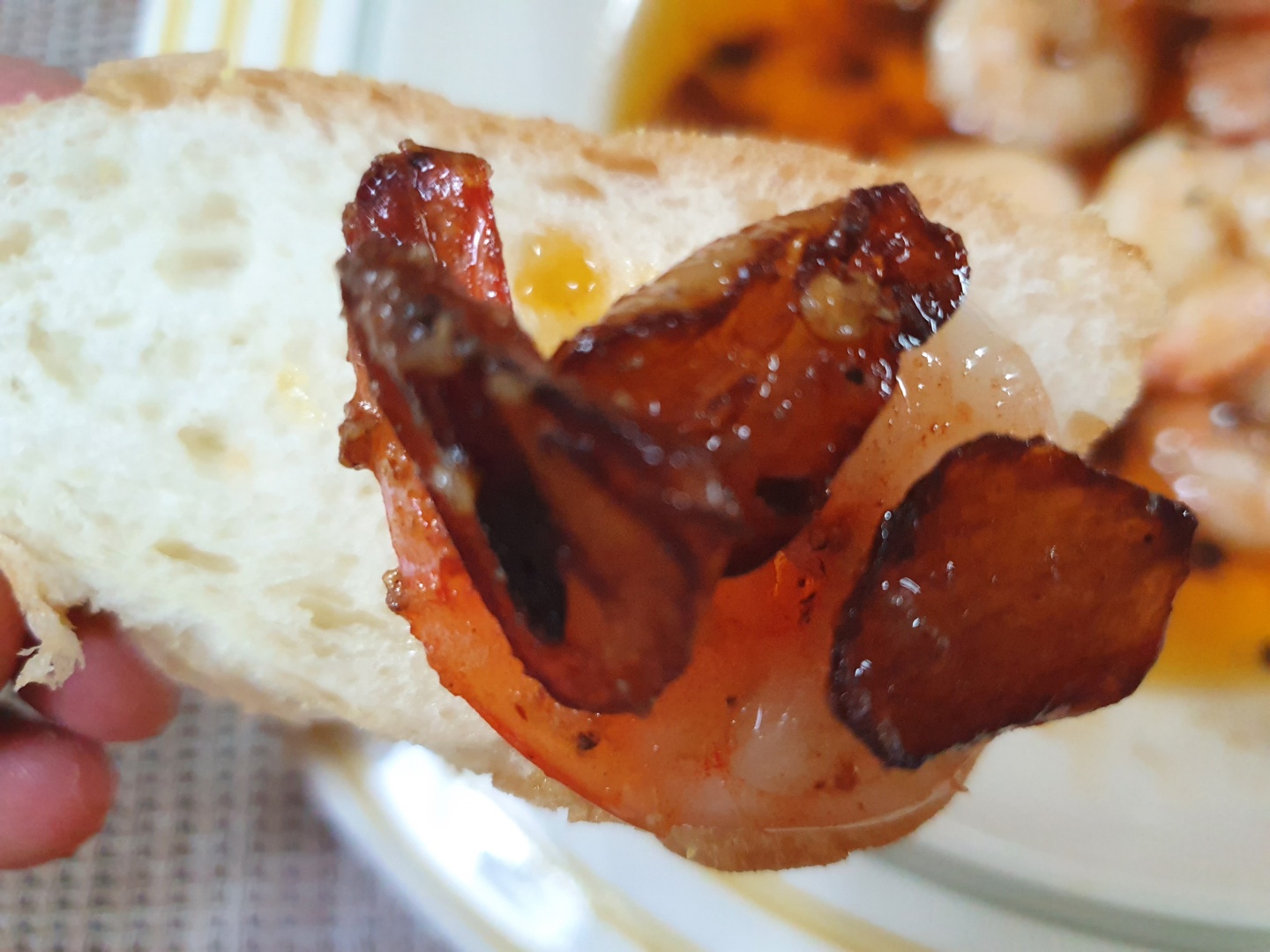 바게트빵에 새우와 편마늘을 얹어서 한입~ 우왕, 각종향신료가 들어가서 소스맛이 특이하면서 새우의 맛과 어울어져서 독특한 맛이 있네요.