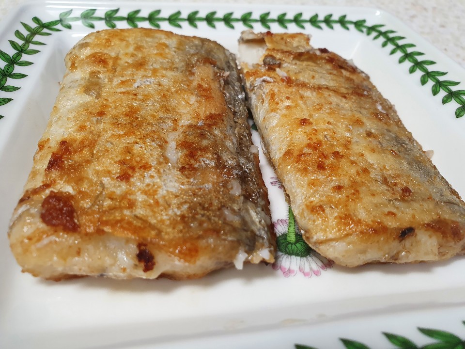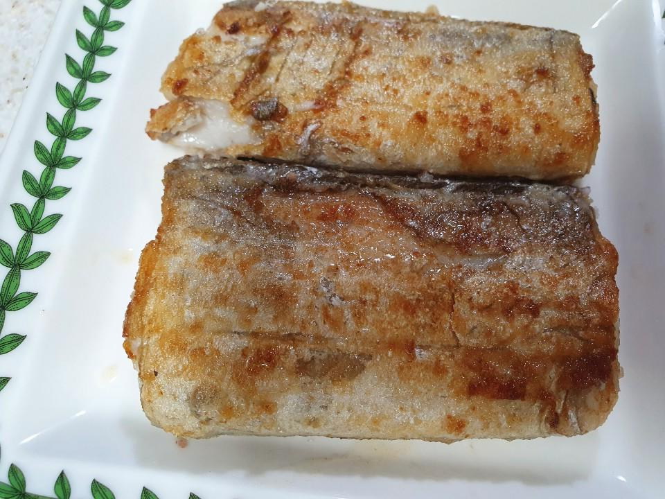 도톰한 칼치구이가 완성되었습니다. 가격이 비싸서인지 확실히 살이 많은게 먹을게 있네요. 가루를 묻혀서 구우니 겉은 바삭하니 보기에도 몹시 먹음직 스러워 보입니다.