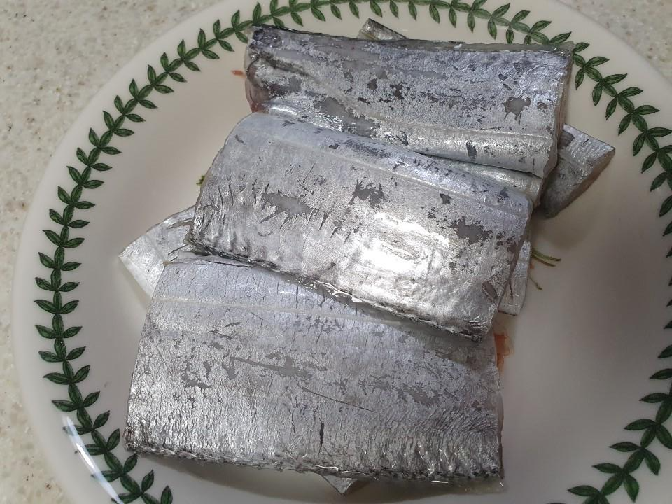 칼치를 비늘을 깨끗이 벗기면 비린내가 덜 난다고 하는데 싱싱한 칼치여서 그냥 사용하기로 합니다.