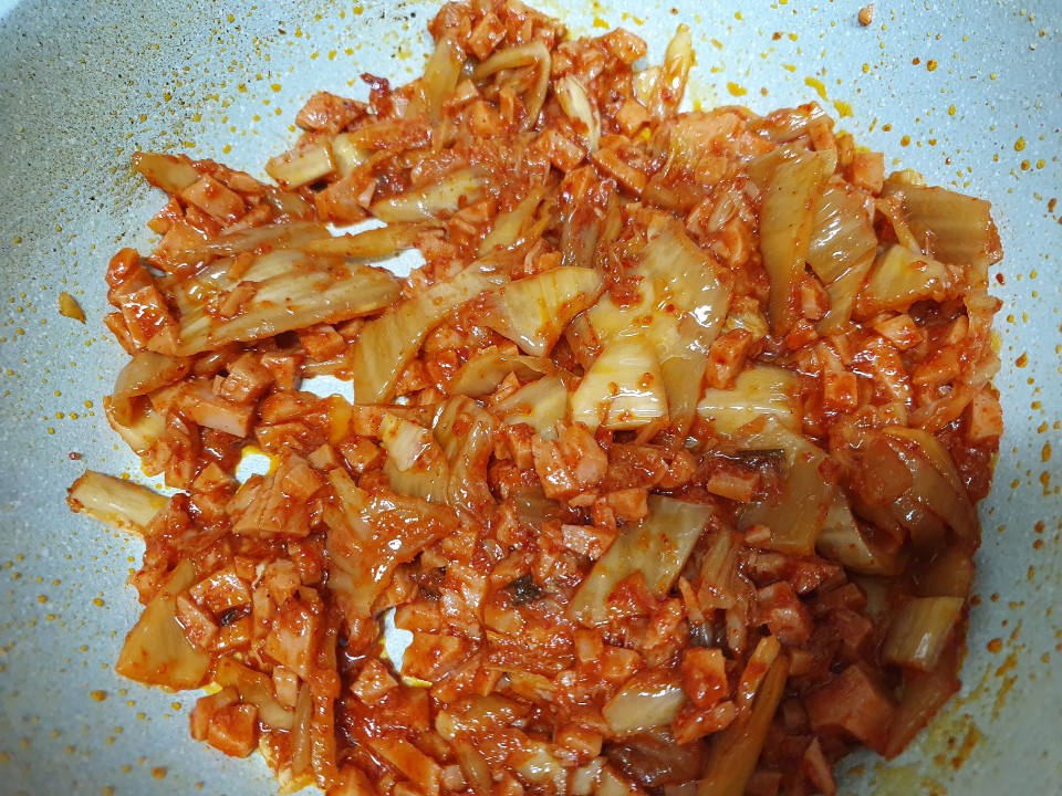 김치가 익어갈즈음 썰어놓은 스팸을 넣고 같이 볶아 줍니다. 스팸의 크기는 기호에 맞게 자르면 됩니다. 스팸은 살짝만 익어도 되기 때문에 슬쩍 볶아 줍니다.