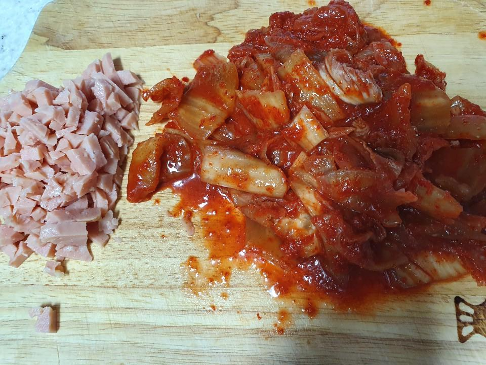 스팸을 잘게 잘라놓고, 잘 익은 김장 김치도 적당한 크기로 잘라 줍니다.