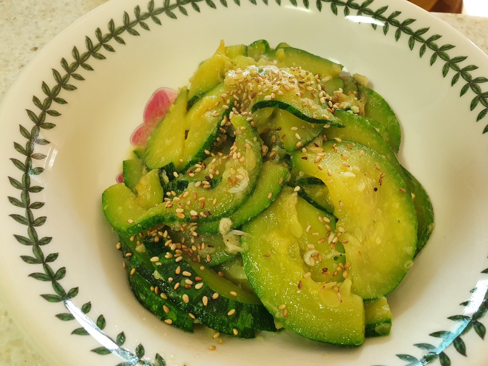 완성된 애호박 볶음입니다. 볶은 통깨를 뿌려 마무리해 줍니다. 애호박볶음은 식어도 맛이 좋아 냉장고에 두고 먹어도 좋습니다. 이상으로 애호박 볶음 포스팅을 마칩니다.