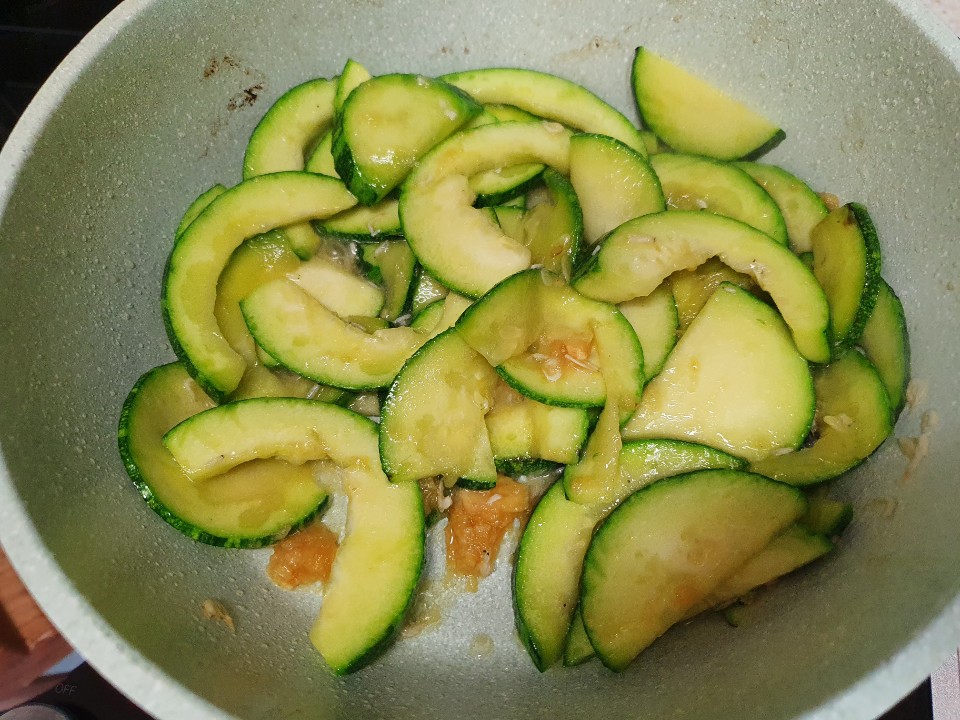 오목한 팬에 썰어놓은 애호박을 넣고 기름에 달달 볶아 줍니다.